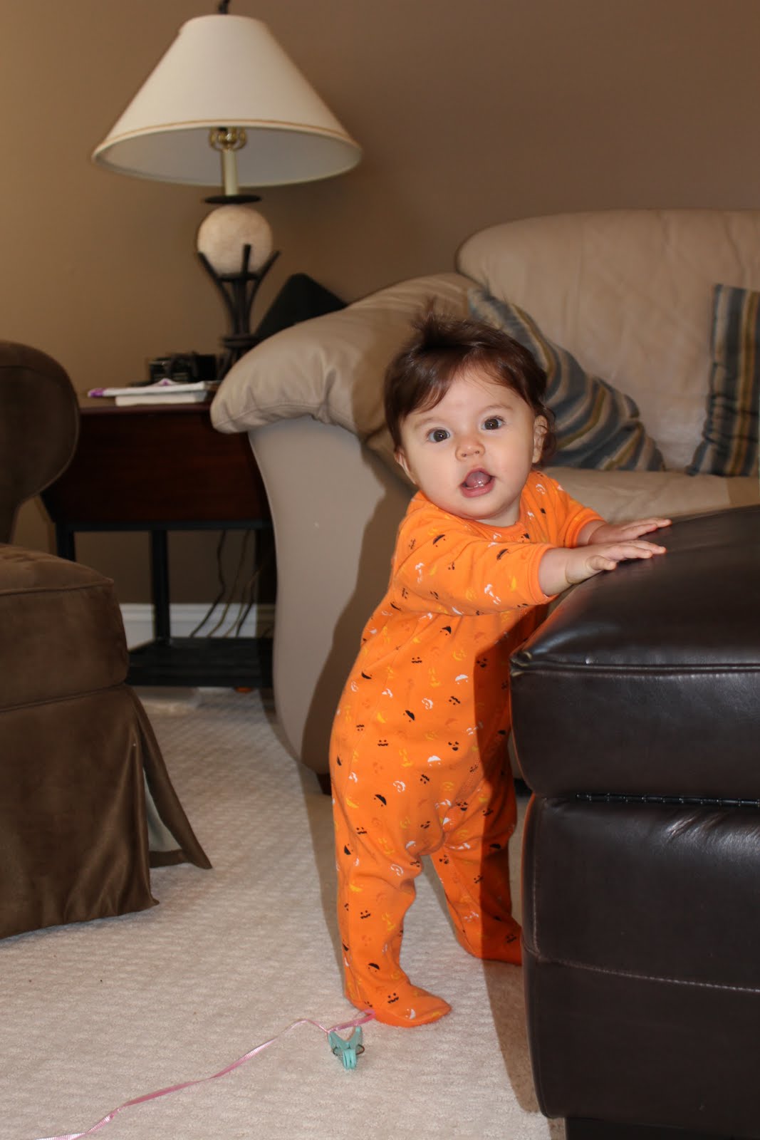This morning was a dry-Cheerios-in-the-family-room-while-watching-Oswald morning. Sylvie was cruising around the ottoman. I took these pictures b/c I thought her hair was a riot and she looked adorable in the Halloween jammies Grandma and Papa got Brady two years ago.