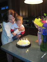 The smoke from all those birthday candles prompted a visit from the Fire Chief. Ha! Just kidding Grandma! Brady's just having fun with the hat he got at the festival yesterday and one of his favorite toys.